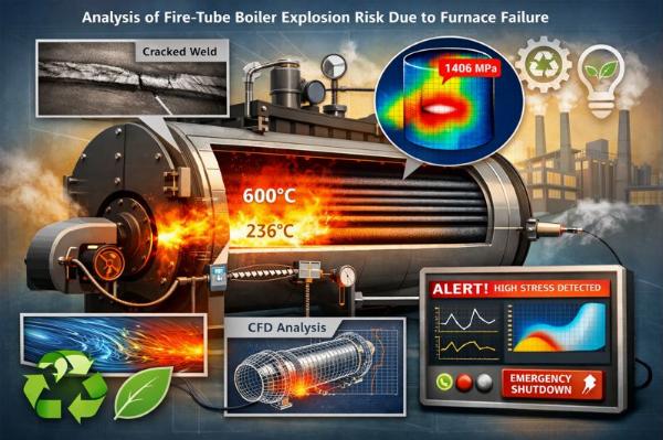 This study investigates the structural integrity thermal behavior and failure risks associated with a horizontal fire-tube boiler (Model MS61681) with a carbon steel furnace constructed according to BS 1501-151 GR K30A. After nearly 29 years of operation approaching the end of its design life per ASM Metal Handbook Volume 11 .This boiler was evaluated through a combination of mathematical modeling, finite element analysis, computational fluid dynamics(Thesis phase 2) and non-destructive testing ..Thermal modeling confirmed that although the boiler typically operates at 236°C, transient startup conditions could rapidly elevate furnace wall temperatures beyond 600°C. These temperatures significantly exceed the critical creep threshold of 450°C, exposing the material to thermal degradation, accelerated creep, and mechanical stress. Mechanical stress analysis showed that at 600°C and the induced stress reached 1406 MPa, surpassing the temperature-dependent yield strength of the material (295–360 MPa). CFD and FEA results (thesis phase 2) further revealed high-stress concentrations at tube sheet joints and welds, aligning with physical inspection data and emphasizing the critical role of thermal fatigue and stress localization in crack propagation.A critical finding was the identification of a penetrated crack along the longitudinal weld seam, located near the burner zone an area exposed to intense thermal stress and suspected flame erosion. Although UTG measurements showed no abnormal thinning and the corrosion rate remained within BS 2790 standards (0.75 mm), the penetrated crack in a high-risk location overrides other acceptable indicators and highlights an urgent structural concern. Continued operation under these conditions without repair or replacement, presents a serious risk of catastrophic failure or explosion.Based on these findings, several policy and practice recommendations are proposed establishing strict temperature control standards to keep furnace wall temperatures within safe limits adhering to minimum wall thickness and reinforcement requirements per international standards and integrating simulation guided design improvements using FEA and CFD for material selection and structural optimization. The study emphasizes the need for regulated NDT inspection protocols focusing on welds, thin walls, and CFD-identified hotspots. Continuous temperature monitoring using thermocouples is recommended for high-risk zones. Stress-based safety systems and automated emergency shutdown mechanisms should replace traditional temperature-based alarms for better operational safety. Integrating smart sensor technologies with CFD/FEA data and machine learning algorithms can enable real time predictive maintenance, aligning with Industry and circular economy principles. This research highlights the critical role of NDT in identifying hidden structural flaws early . These practices are essential not only for enhancing operational safety but also for extending boiler lifespan in line with circular economy principl also provides a framework for transforming boiler operation from reactive maintenance to proactive, predictive management grounded in data, engineering standards and simulation intelligence. Future research directions include developing multiphysics simulation models that couple fluid dynamics, combustion chemistry, structural mechanics, and thermal behavior to capture more complex failure mechanisms. Investigation into advanced materials and refractory coatings is also encouraged to reduce heat induced stress. Additionally, incorporating long-term creep and degradation modeling will improve lifecycle predictions.